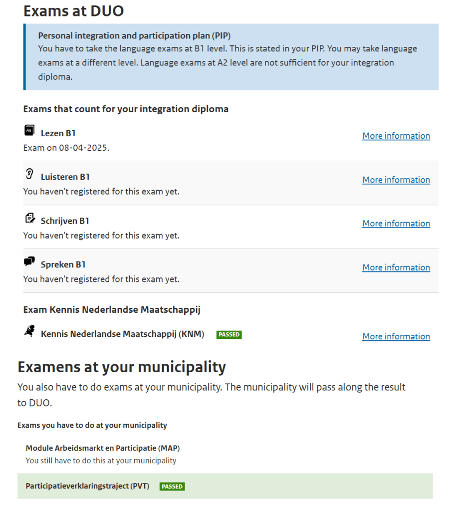 My experience: I’m following the B1 route. My PIP requires me to pass Dutch language exams (Listening, Reading, Speaking and Writing) and Knowledge of Dutch Society (Kennis Nederlandse Maatschappij, KNM) at DUO. Meanwhile, the Module Arbeidsmarkt en Participatie (MAP) and Participatieverklaringtraject (PVT) must be completed through my municipality.